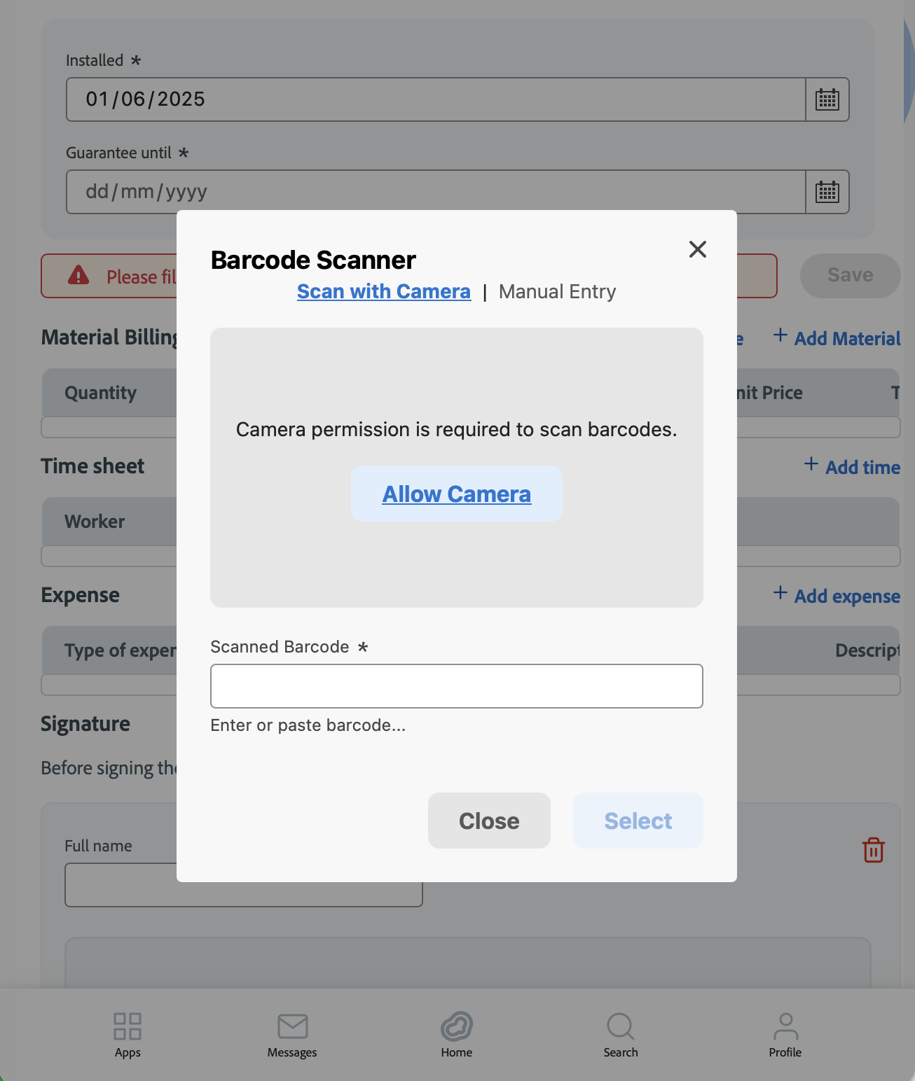 - Barcode scanning for material entry: Add items by scanning a barcode/QR code, reducing manual typing and helping prevent errors.